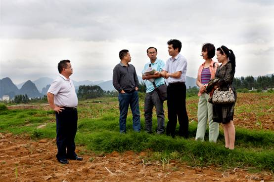 柳州市档案局局长罗方贵(右三)、纪检组长周桂柳(右二)在融水县委常委、办公室主任潘文辉(左一)陪同下实地查看了新馆规划建设用地,
