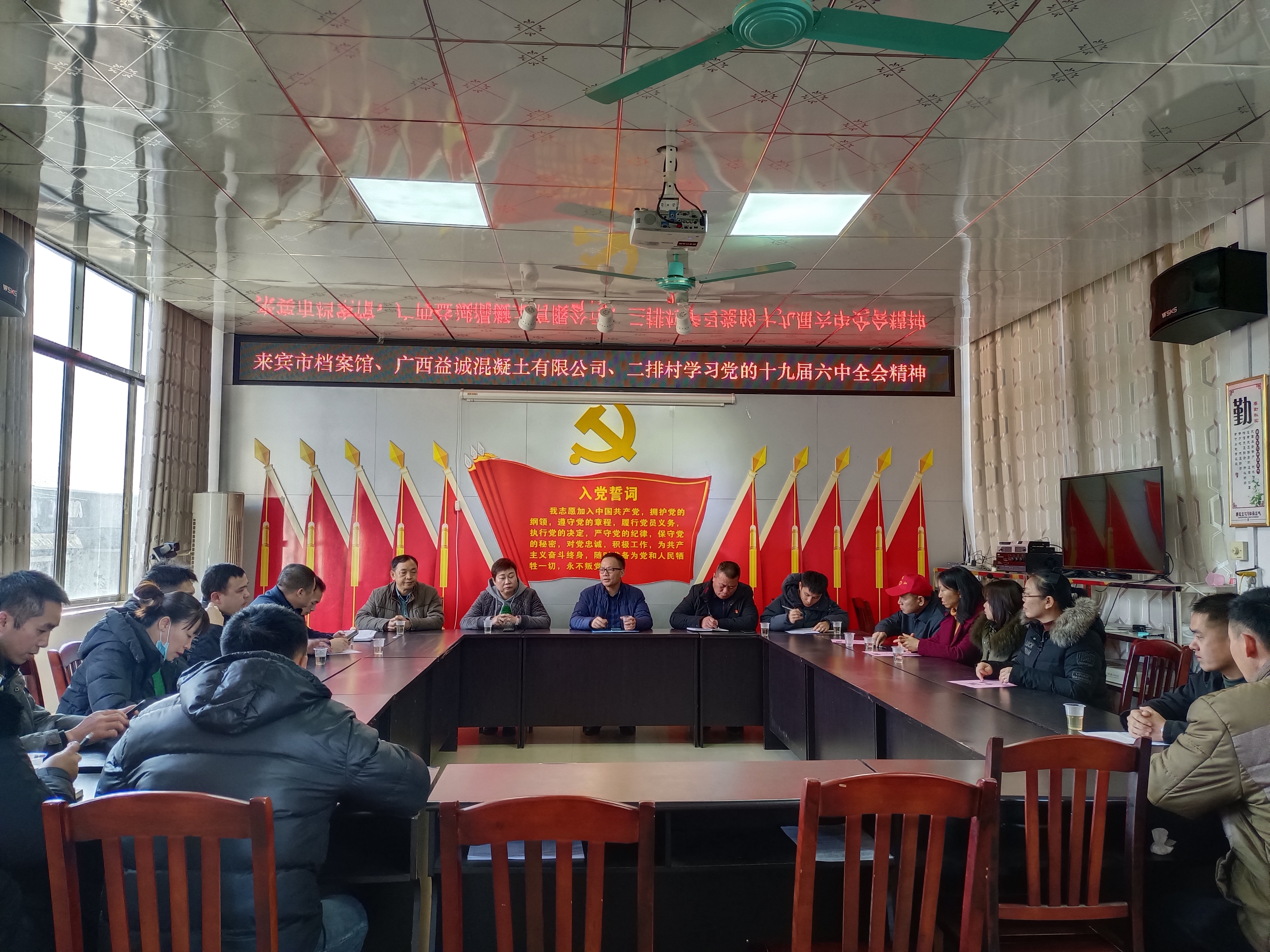 来宾市档案馆党支部、广西益诚混凝土有限公司党支部、二排村党总支部召开“党旗领航·机关联企助村”座谈会并学习党的十九届六中全会精神