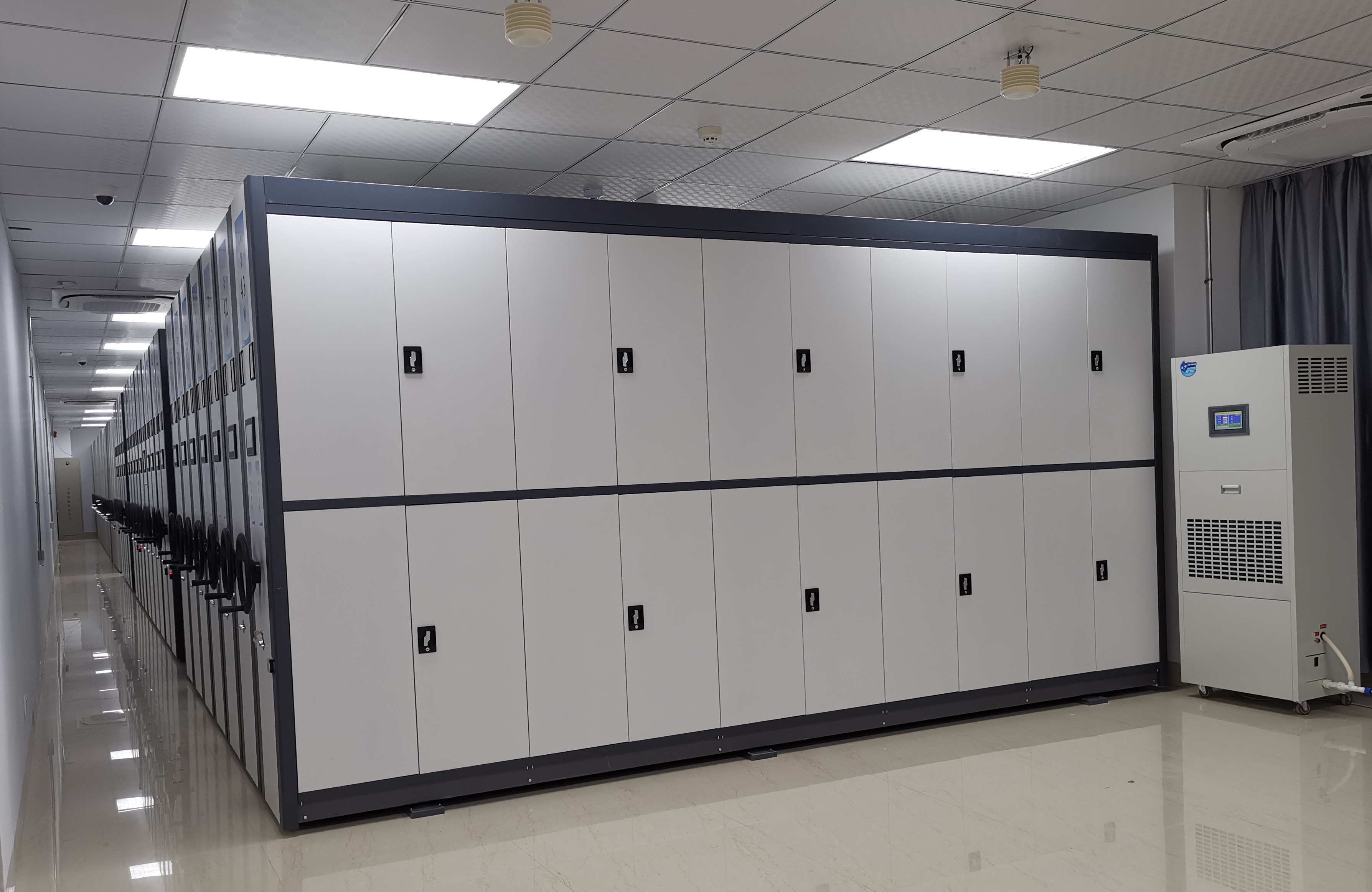 一是依靠科技创新,打造智能库房。坚持智能、安全、可控原则,对档案库房进行升级改造。配置了视频监控防盗自动报警系统、自动报警气体灭火系统、恒温恒湿自动控制系统、档案门禁系统及智能加湿除湿消毒净化一体机。智能加湿除湿消毒净化一体机可根据南方天气变化情况,自动进行加湿或除湿工作,同时,对人员进出库房带入的一些粉尘、气体进行自动灭菌,达到净化空气、防止档案潮湿霉变、生虫效果。四大系统通过技术联动,利用温湿度传感器、烟感探测器将库房各项数据统一存储在一体监控平台上。库房外的一体监控平台通过收集四大系统反馈数据,实时智能化监测库房内温湿度、烟雾状况,同时利用视频监控报警系统及门禁系统在非工作时间段进行布防,监控人员进出库房情况。当出现异常数据时一体监控平台会自动报警并通过手机短信报告信息至档案管理工作人员,从而实现对档案设备、环境状态、人员出入库房情况的24小时不间断智能监控,保证档案安全、科学化管理。