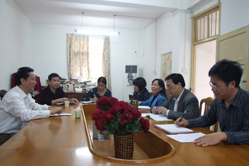崇左市委副秘书长邹耀平(左一)和崇左市档案局(馆)干部座谈