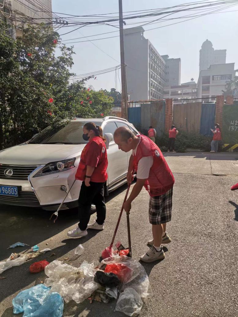 党员志愿者身着红马甲,拿着锄头和扫把,清理社区主要道路上的杂草,仔细清扫社区主要道路上的烟头、饮料瓶、纸屑等垃圾,帮助老旧小区清扫楼道卫生,为社区营造文明、整洁、干净的环境。