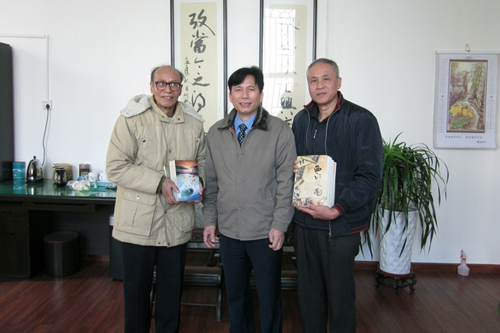 梧州市档案局局长何敏汉(中)与广西作家协会会员、梧州市著名作家李培燊(左)、李小舰父子合影