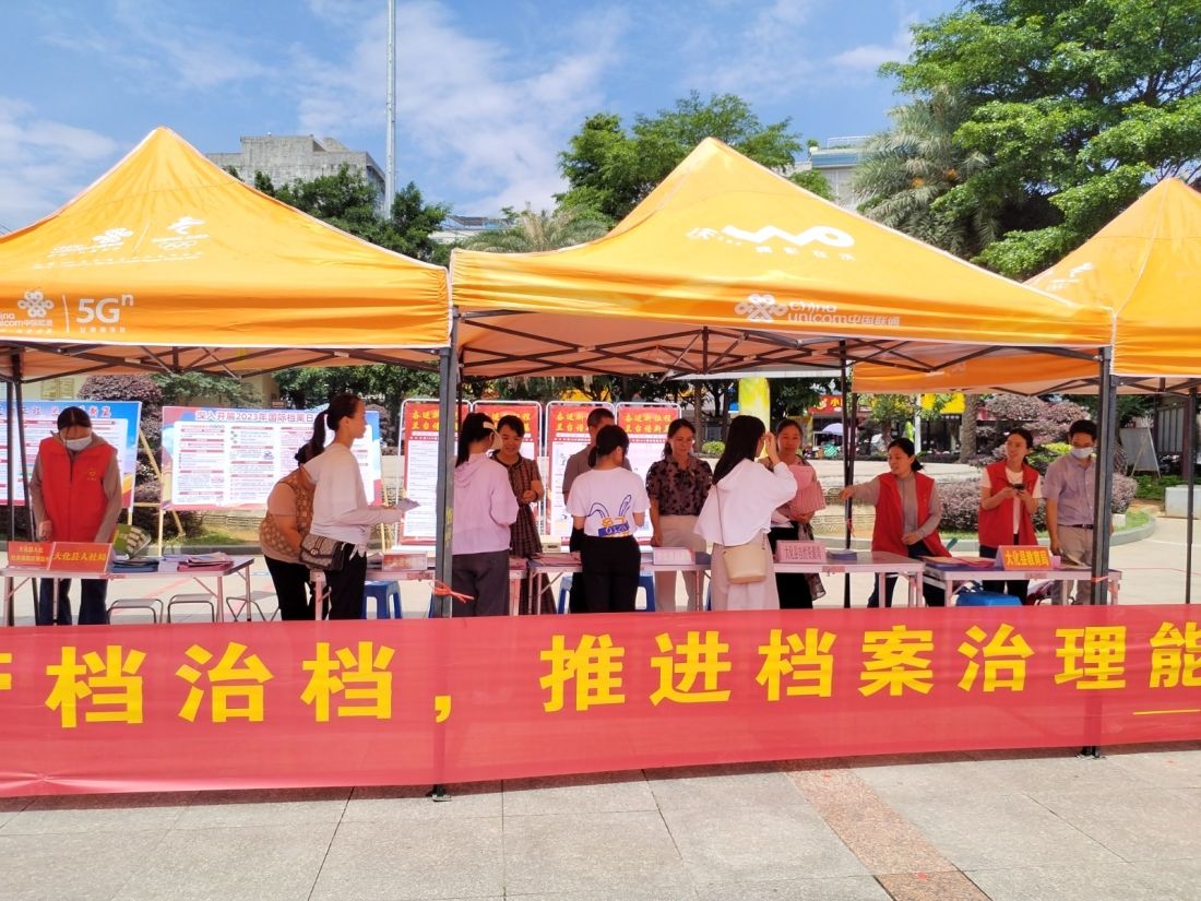 6月9日上午,县档案局、档案馆联合县农业农村局、县教育局、县卫健局、县人社局、县自然资源局等涉及民生领域的单位,在县铜鼓广场开展集中宣传咨询活动。活动现场布设档案宣传展板8块,设置档案咨询服务台6个,为群众解答档案法律法规、档案知识和民生档案查档等方面的问题,并面向群众发放相关宣传资料500余份,有效提升了群众对档案的认知度和档案意识。为提高群众的参与度,各单位还准备了围裙、折扇、购物袋等文创纪念品,免费发放给群众。