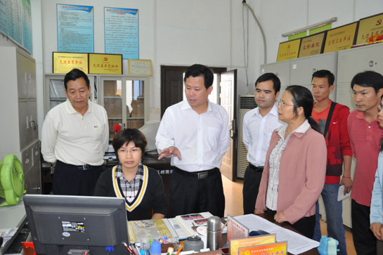 贺州市委常委、组织部部长 覃黎魁(左三)在贺州市档案局调研创先争优工作