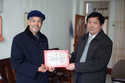北流市档案馆积极开展档案资料的征集工作,十一五期间,共征集到反映地方特色和民间习俗的书籍、族谱等各种珍贵史料共92本(册),丰富了馆藏。图为档案馆领导(右)给热心捐赠书籍的作者李业振先生(左)颁发收藏证。