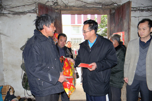 来宾市档案局局长谢文斌(中)给贫困党员送上慰问金