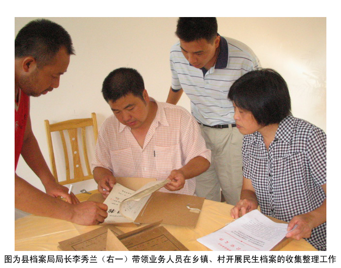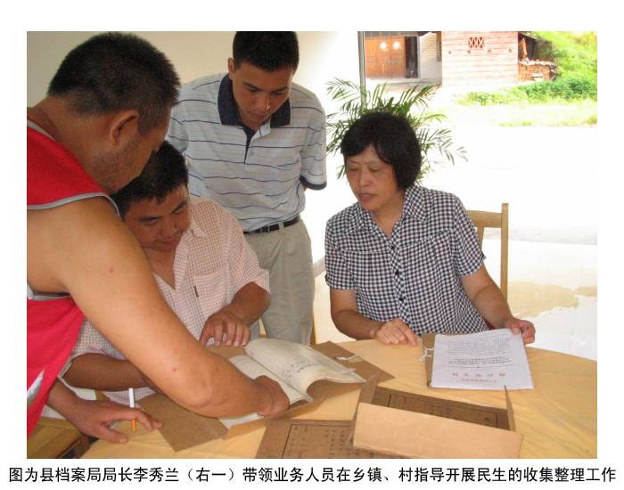为认真贯彻落实民政部、国家档案局《关于加强民生档案工作的意见》等文件精神,今年来,资源县积极采取有效措施大力加强和开展民生档案工作。一是县委政府及时出台相关文件。县委政府专门下发了《关于开展农村山林土地、家庭婚姻等民生档案材料抢救收集整理工作的通知》,对民生档案工作的范围、要求作出了详细的规定,明确了档案及各有关涉农部门的职责,确保民生档案工作得到有效开展;二是经费上给予保证。县人民政府在县财政十分困难的情况下仍拨出3万多元专款作为民生档案工作开展专项经费;三是加强对民生档案业务指导 。县档案局(馆)派出业务人员深入县直、各乡(镇)、行政村开展民生档案的抢救、收集、整理等业务指导工作。经过各级部门和广大档案工作者的艰辛努力,至今为止共收集农村山林土地、家庭婚姻等各类民生档案近2000多卷,并及时整理接收入馆保藏利用,为维护人民群众的切身利益构建农村和谐社会作出了贡献,得到了广大群众的一致好评。