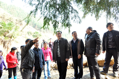 黎富文局长(中)一行调研农田水利建设和“村屯绿化、饮水净化、道路硬化”等专项活动开展情况。