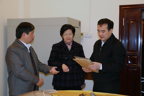 图为自治区档案局局长黎富文(右一)在河池市委常委、宣传部长、副市长黎丽(中),河池市档案局局长苏灵(左一)的陪同下,实地检查河池市档案馆。