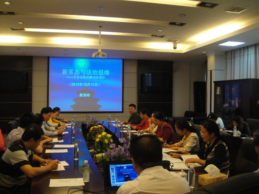 讲座邀请市反腐倡廉教育巡讲团成员、市法制办副主任黄清明前来授课。主要内容有:新常态概述、法治思维、新常态下我们面临的挑战、适应新常态切实提高依法行政能力四个方面。黄副主任从速度、结构、动力、挑战四个方面分析了经济新常态,从全面深化改革、全面依法治国、全面从严治党三个方面深入分析了政治新常态,对法治思维作了简要概述,对新常态下我们面临的挑战作了具体的分析,对如何适应新常态提出了很好的建议,强调适应新常态必须切实提高依法行政能力。