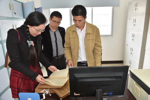 东兰县档案局韦利欢副局长(左一)在长乐镇档案室开展档案执法检查