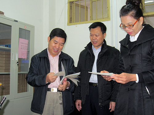 图为崇左市委组织部李永盛副部长(左一)在崇左市档案局馆长李明(左二)的陪同下了解市直机关档案归档情况