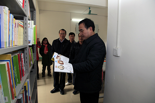 图为黎富文局(馆)长察看民新村希望小学图书室建设情况