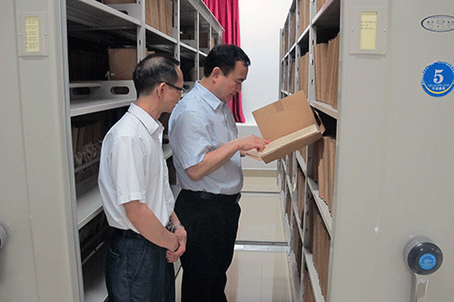 自治区档案局局长黎富文(右一)在贵港市档案馆库房查阅档案