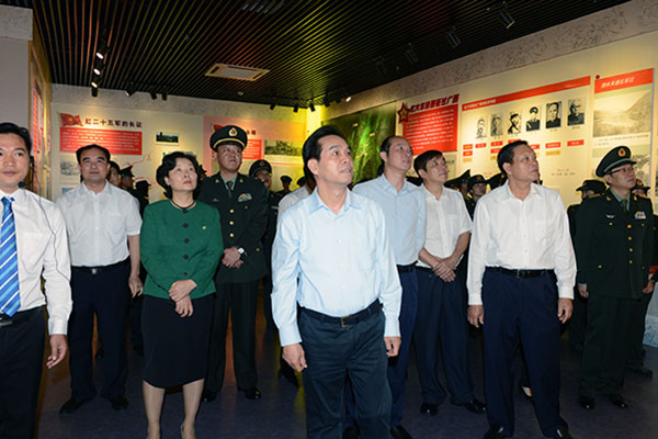 自治区党委常委、宣传部长黄道伟(前排中)、自治区人大常委会副主任杨道喜(右二)、自治区人民政府副主席黄伟京(右四),自治区政协副主席高枫(右三),以及南部战区陆军政治工作部副主任张剑(右一),广西军区副司令员万苏晋(左四)等自治区领导在自治区档案局馆长黎富文(左二)陪同下参观“壮丽史诗 永恒丰碑——广西纪念中国工农红军长征胜利80周年图片展”。