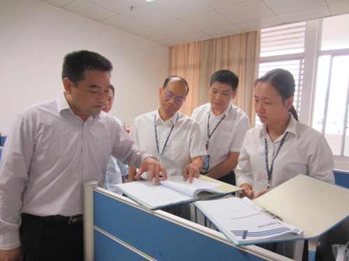 图为检查组组长崇左市档案局副局长孟立荣(左一)在崇左供电局检查档案检索目录情况