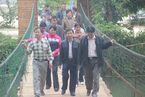 大新县局长赵锋敏(中),北三村委主任黄敏(左一),档案局业务指导股长、驻北三村指导员陆进娜(后第二排左一)和屯长参观体验景区吊桥。许泽民摄