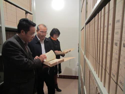 图为广西区档案局副局长农民智(左二)在检查崇左市档案馆馆藏档案的安全保管情况