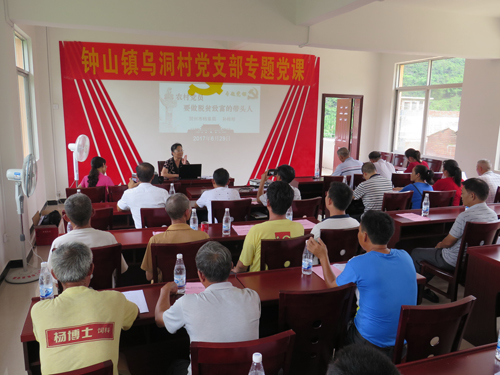 6月29日,孙桂珍局长一行来到乌洞村部,与钟山县委书记唐先程、驻村第一书记及镇、村主要领导等为新建成的乌洞村委办公楼揭牌。随后,孙桂珍以“农村党员要做脱贫致富的带头人”为主题,以学理论、观视频、谈体会等形式,为乌洞村40多名农村党员上了一堂生动的专题党课。