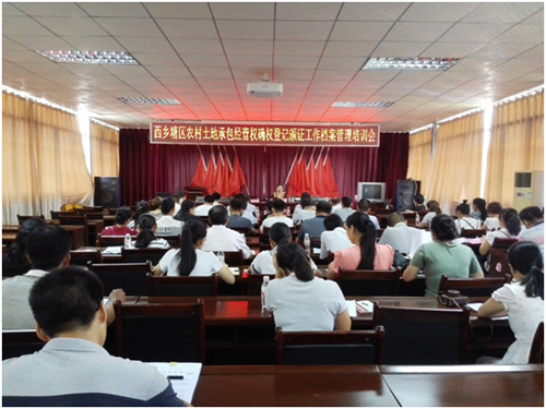 为规范南宁市西乡塘区农村土地承包经营权确权登记颁证工作,提高农村土地承包经营权确权登记颁证档案材料的归档整理水平,发挥土地承包经营权确权登记颁证档案信息资源的作用,顺利完成2017年农村土地承包经营权确权登记颁证档案工作任务。6月27日上午,西乡塘区农林水利局、档案局联合在金陵镇五楼会议室举办农村土地承包经营权确权登记颁证工作档案管理知识培训。培训会由西乡塘区农林水利局土地确权分管领导陈志玲主持,档案局业务员闭绍芳主讲。参加培训的有西乡塘区确权办全体人员、各中标技术服务企业档案员、包村干部、“三镇一办”档案员等69人。培训会采用现场授课和现场观摩实体档案的方式进行。授课结束后,与会人员参观了双定镇土地确权的实体档案,并就农村土地承包经营权确权登记颁证档案归档整理中存在的问题进行交流。