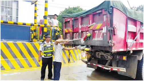 散体物料运输车司机在执法人员的监督下清除车体残留的泥沙。杨玲 摄