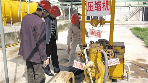 南宁市安监局执法人员对合成氨储罐区进行检查。