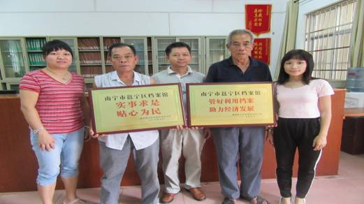 近日,南宁市邕宁区蒲庙镇光和村那岳坡2名村民代表,无比激动地将两块分别写着“实事求是,贴心为民”、“管好利用档案,助力经济发展”字样牌匾赠送到邕宁区国家档案馆工作人员的手中,表示对该馆为其提供优质、热情、贴心、周到、高效的服务表示感谢。