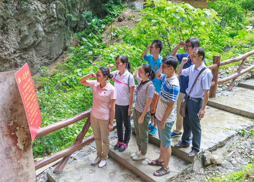 进入溶洞,支部书首先对“猪笼洞”艰苦奋斗精神进行讲解,并给党员上党课,重温入党誓词宣誓,党课用真人、真事把瑶山人历史“讲活”,使党课培训效果真正做到“入心入脑”。在随后的穿越“猪笼洞”、攀爬天梯现场体验,让党员们身临其境,深有感触,真真体验到了什么是艰难困苦,大家被古老而勤劳的背陇瑶,世代的瑶山人只能每天背着背篓贴身沿梯攀爬穿洞而行,出入村里的“不畏艰险、吃苦耐劳、敢于穿越”的“猪笼洞”精神所震撼,所鼓舞。