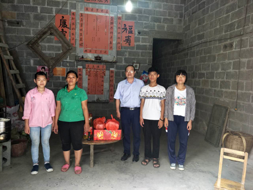 都安县档案局真情牵系贫困户,攀“穷亲”,把党和政府的温暖传递给帮扶群众。正值中秋节、国庆节两节即将来临之际,9月28、29日,该局干部分为两批自己购买月饼、面条、食用油等生活用品,进屯入户慰问贫困户。通过慰问活动,进一步拉近距离,加深了解群众的疾苦,使他们增强了战胜贫困的决心和勇气。贫困户们表示,一定响应政府的号召,积极配合扶贫工作队,因地制宜,不靠不等,自力更生,早日摘掉穷帽,斩断穷根。图为韦宇局长(右三)慰问他帮扶的特困户(户主刚逝,遗孀聋哑残疾,4个孤儿在读中小学),并与他们合影。