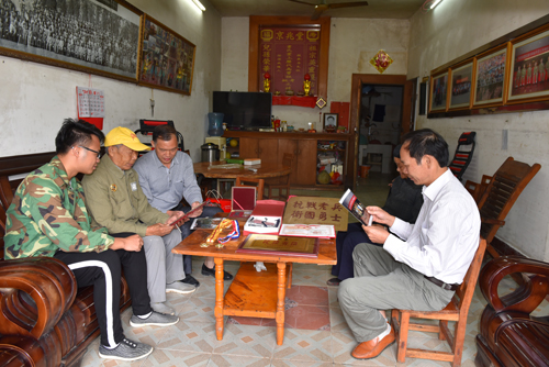 在九旬抗战老兵韦忠诚家里,东兰县档案局工作人员与韦老促膝长谈。韦老虽已年过九十,但一谈到抗日战争和2015年在北京参加纪念抗日战争胜利70周年阅兵的经历时,便精神焕发,还一一展示、讲解他所珍藏的勋章、证书、照片等。