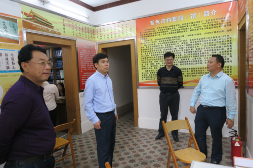 近日,百色市政协主席梁建强在副秘书长周明象的陪同下到百色市档案馆调研。梁建强一行听取了市档案局党组书记鲍荣纲、局(馆)长邓卓的情况汇报,参观了数字化加工现场,查看档案库房安全情况,观看档案陈列室,还详细了解新档案馆二次装修进度。