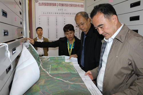 图为自治区档案局局长黎富文(右一)检查指导农村土地确权档案工作。