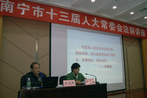 南宁市人大常委会副主任袁曼虹(右)主持讲座,南宁市档案局局长廖茂隆授课(左)。