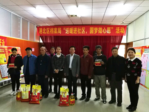 在“送暖进社区 圆梦微心愿”活动中,港北区档案局党员干部作为圆梦人,为8户困难群众送上了米、油及慰问金,同时以支部名义看望、慰问结对的贫困户,了解、询问家庭生活困难情况,让低保、残疾人贫困家庭感受到党组织的温暖和党员的爱心。