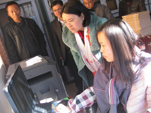 图为恭城瑶族自治县副县长蒋舒羽查看档案数字化扫描工作情况。
