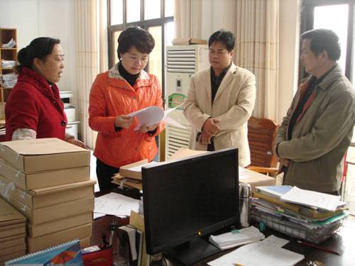 北流市委常委、市宣传部部长、副市长倪惠宽(左二)在查看破产改制企业档案资料