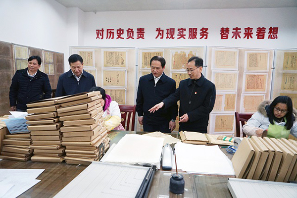 梧州市委书记全桂寿(右三)和市委常委、秘书长黎永益(左二)听取市档案局局长宁波(右二)介绍馆藏档案裱糊情况