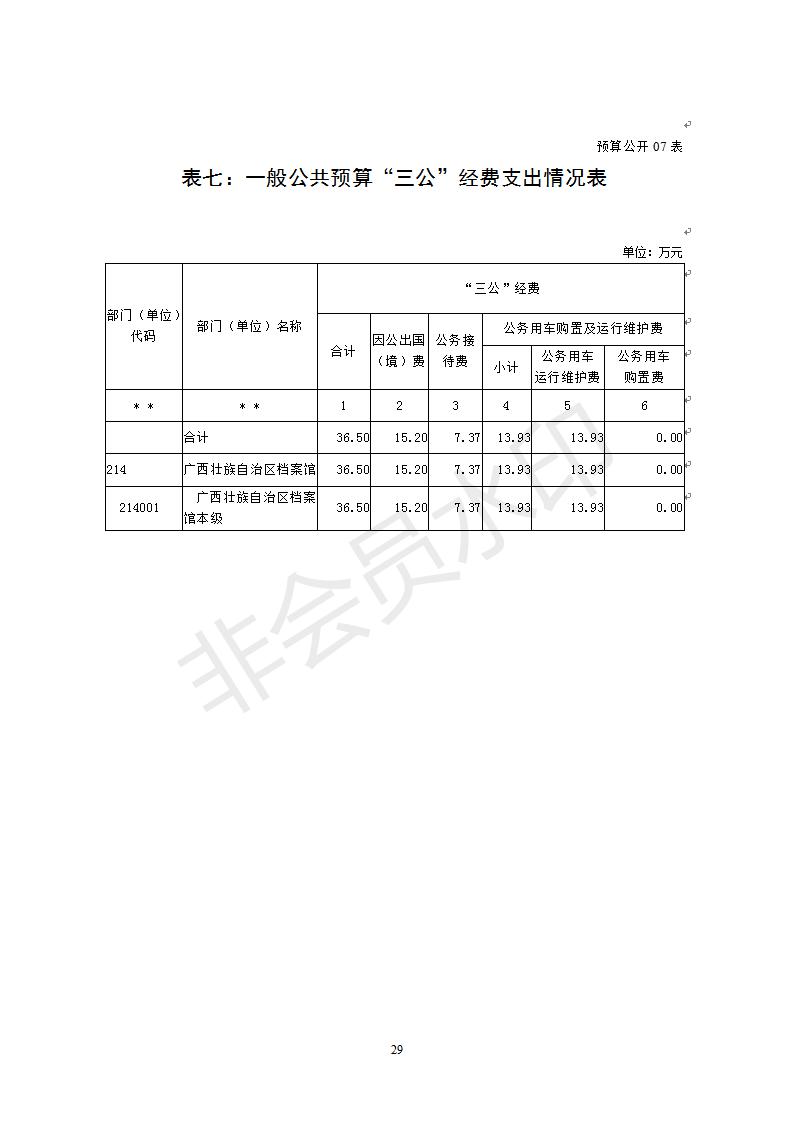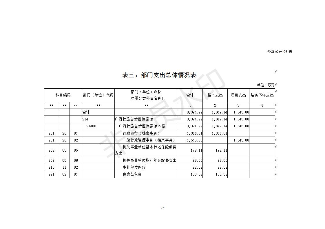 十四、一般公共服务(类)档案事务(款)行政运行(项):主要用于我馆为保证日常运转发生的基本支出。如根据国家规定的基本工资和津补贴标准等安排的人员经费支出、按自治区统一规定的开支标准安排的办公费、印刷费、水电费、培训费、差旅费、会议费等日常公用经费支出。