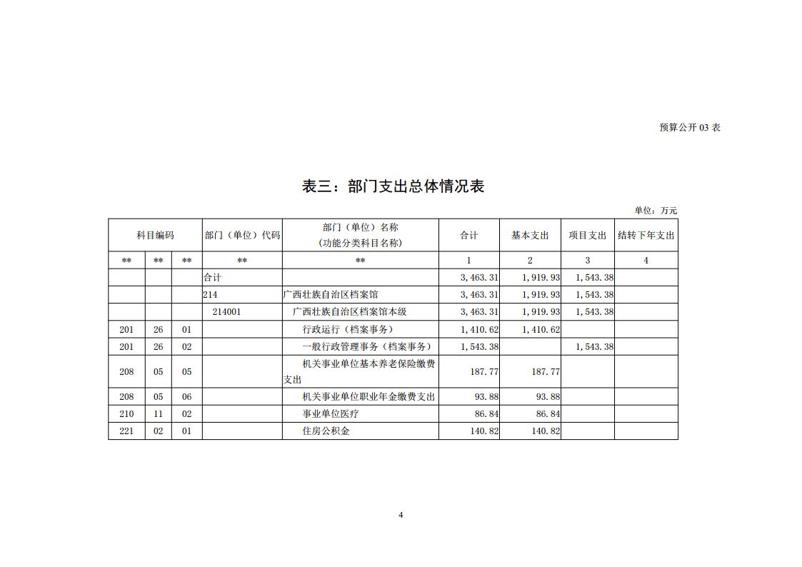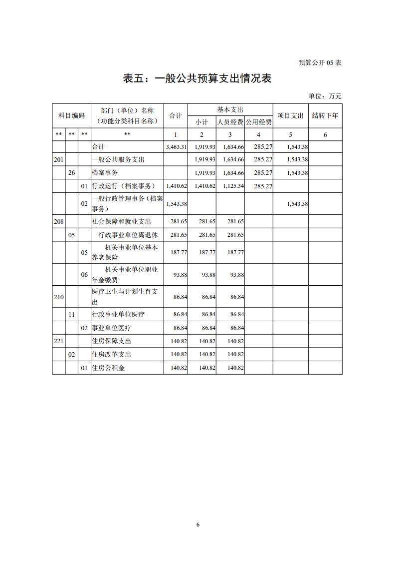 十四、一般公共服务(类)档案事务(款)行政运行(项):主要用于我馆为保证日常运转发生的基本支出。如根据国家规定的基本工资和津补贴标准等安排的人员经费支出、按自治区统一规定的开支标准安排的办公费、印刷费、水电费、培训费、差旅费、会议费等日常公用经费支出。