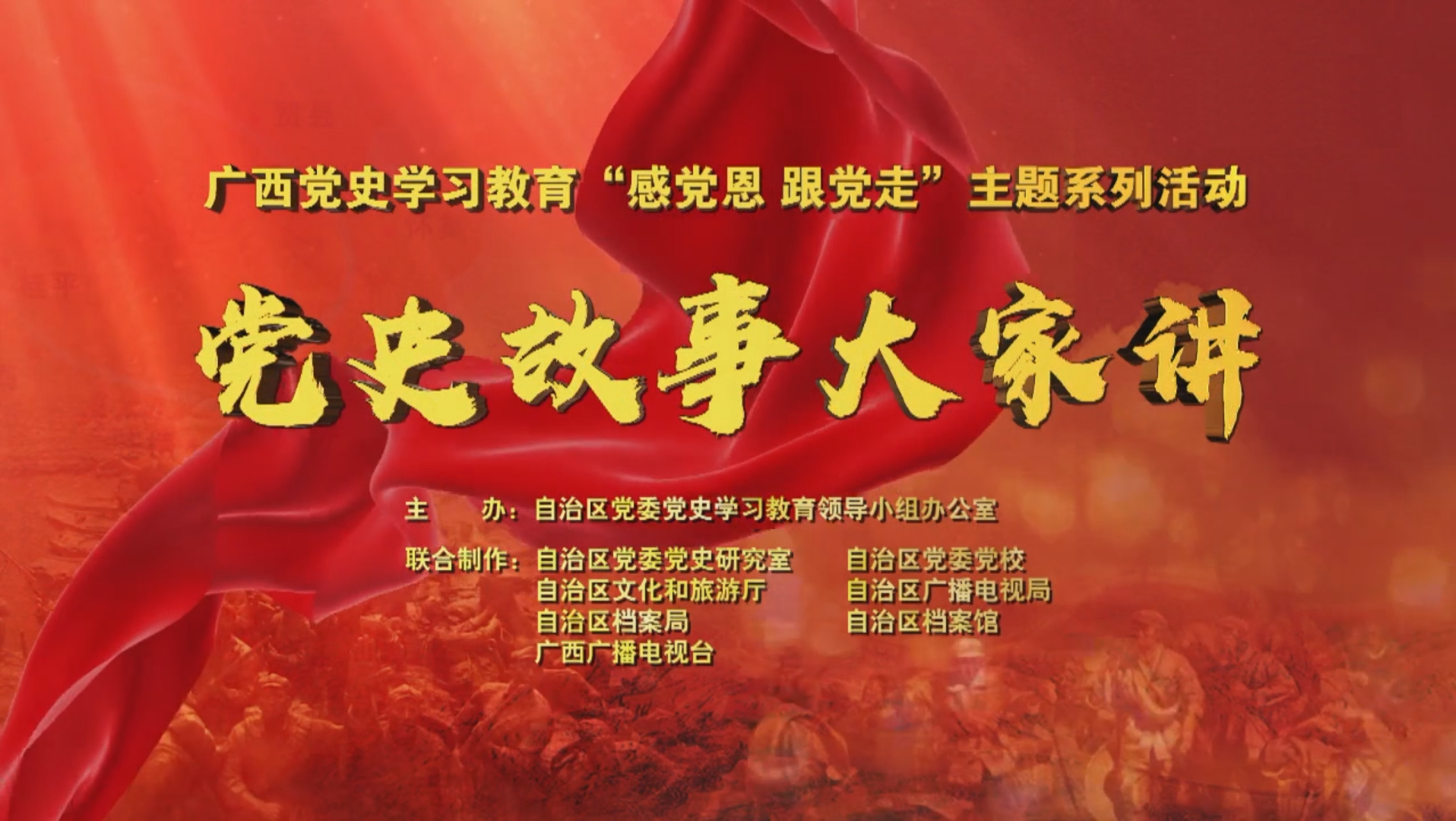 为深入开展党史学习教育,自治区党委党史学习教育领导小组办公室推出“广西党史学习教育‘感党恩 跟党走’主题系列活动·党史故事大家讲”融媒体节目。该节目由自治区党委党史研究室、自治区党委党校、自治区文化和旅游厅、自治区广播电视局、自治区档案局、自治区档案馆、广西广播电视台联合制作,以我区现存重要党史遗址、遗迹、文物、档案为载体,充分发掘这些资源背后所承载的红色故事,多角度、多形式、多题材讲述中国共产党领导广西各族人民进行革命、建设和改革发展的光辉历程。