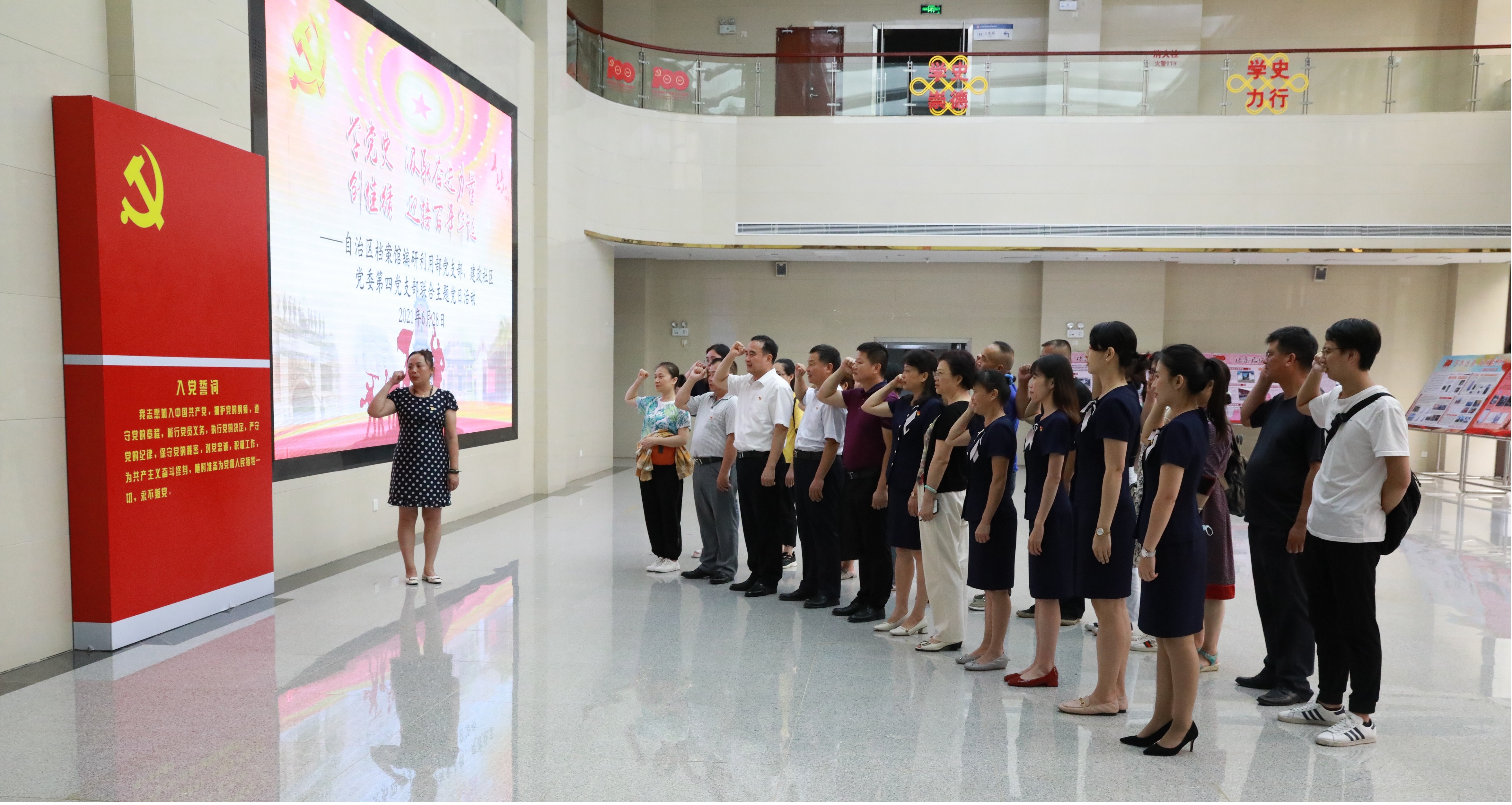 为了拓展机关党组织与所报到社区党组织结对共建成果,建立健全互帮互助的长效机制,近日,自治区档案馆编研利用部党支部和建政社区党委第四党支部以“学党史 汲取奋进力量 创佳绩 庆祝百年华诞”为主题开展党日活动,集体参观《红色广西——革命历史档案史料展》和《百年征程 初心永恒——庆祝中国共产党成立100周年暨广西建立组织96周年档案图片展》,观看开国大典彩色影像视频,集体重温入党誓词,激情合唱红歌《社会主义好》《我们走在大路上》等,联合上主题党课。自治区档案馆馆长黎富文同志以普通党员身份参加活动。