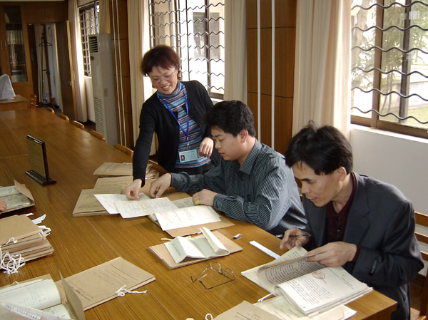 档案接待利用室党员郑国兴(图右一)接待档案查阅人员