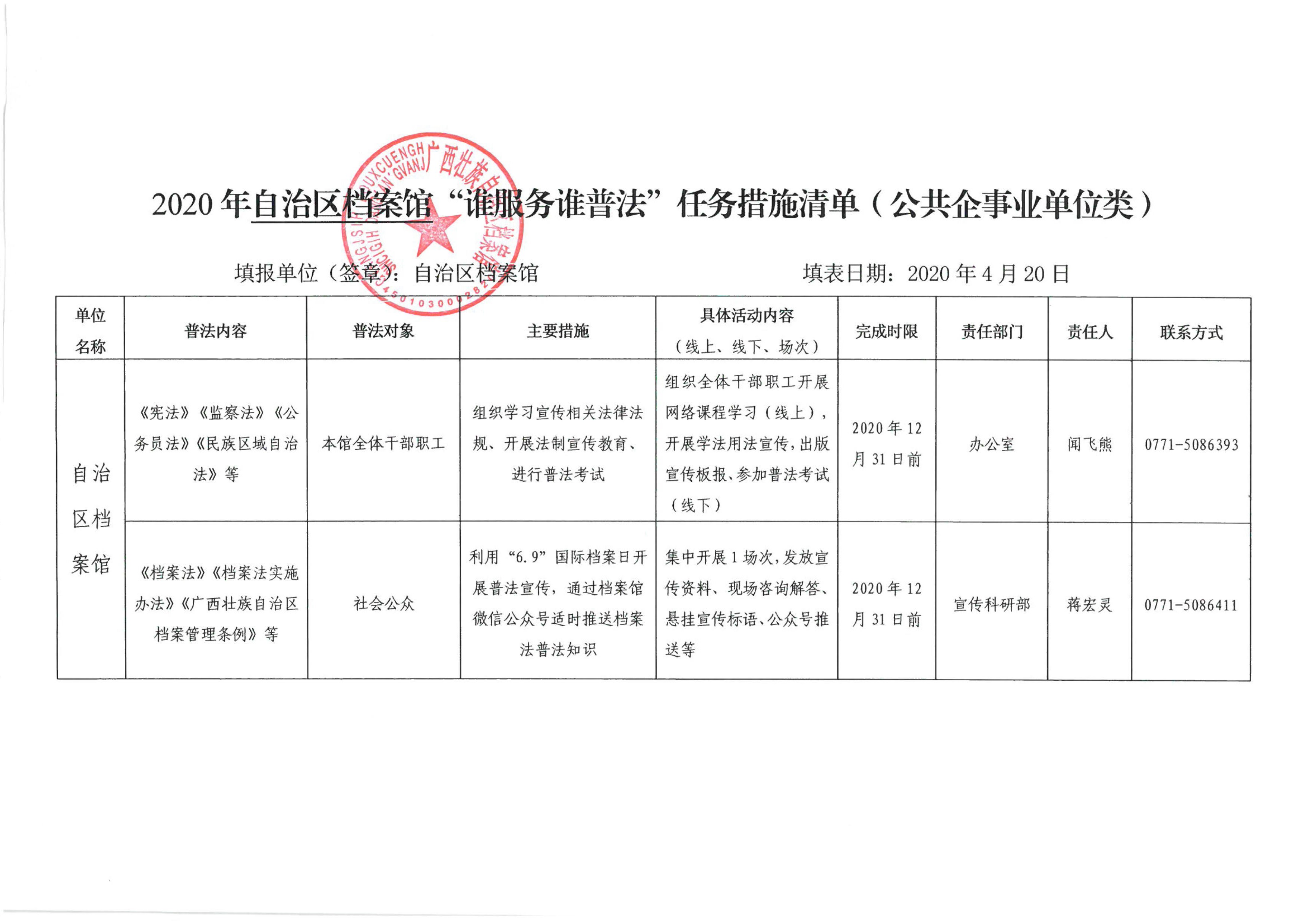 2020年自治区档案馆“谁服务谁普法”任务措施清单(公共企事业单位类)
