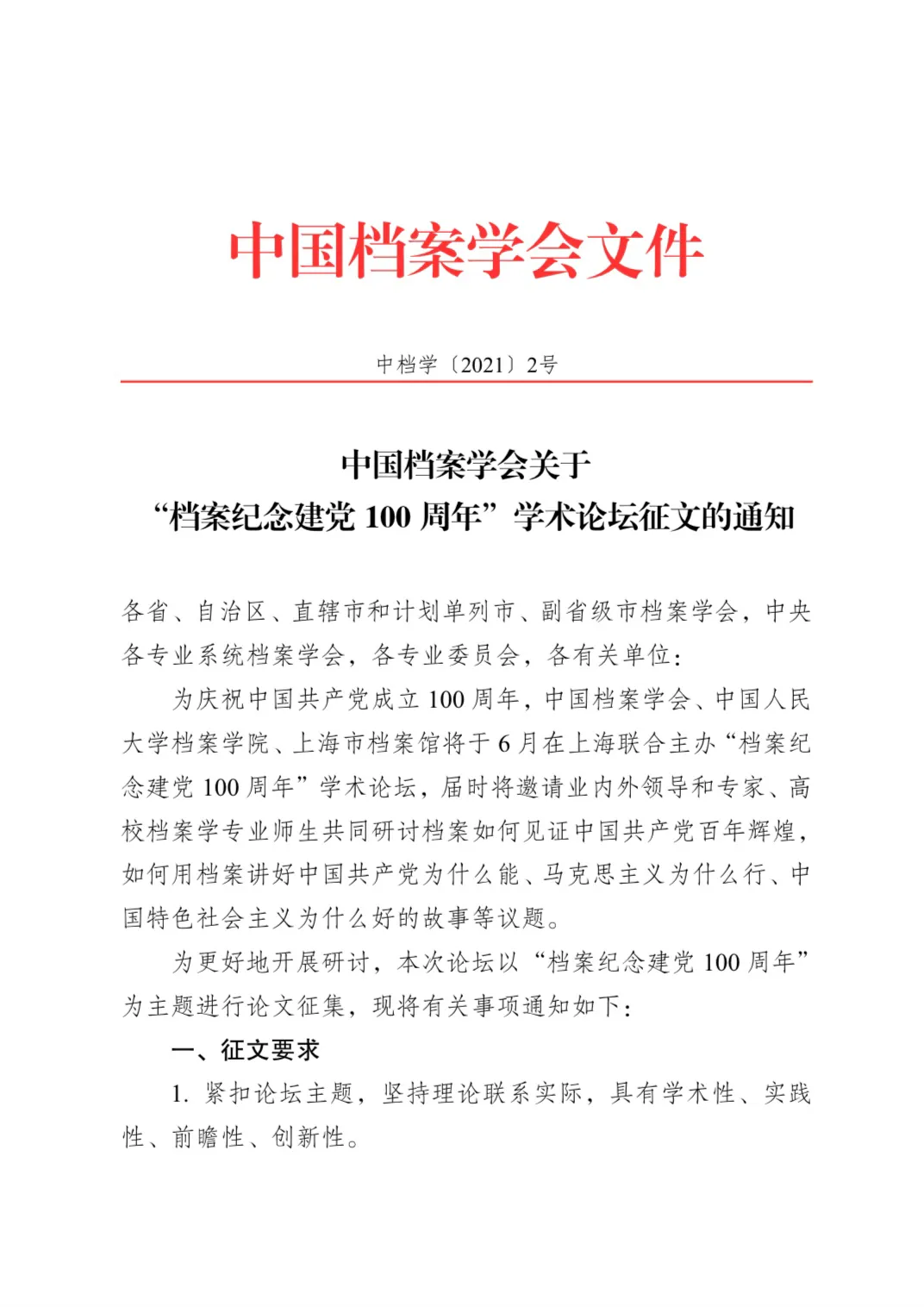 中国档案学会关于“档案纪念建党100周年”学术论坛征文的通知