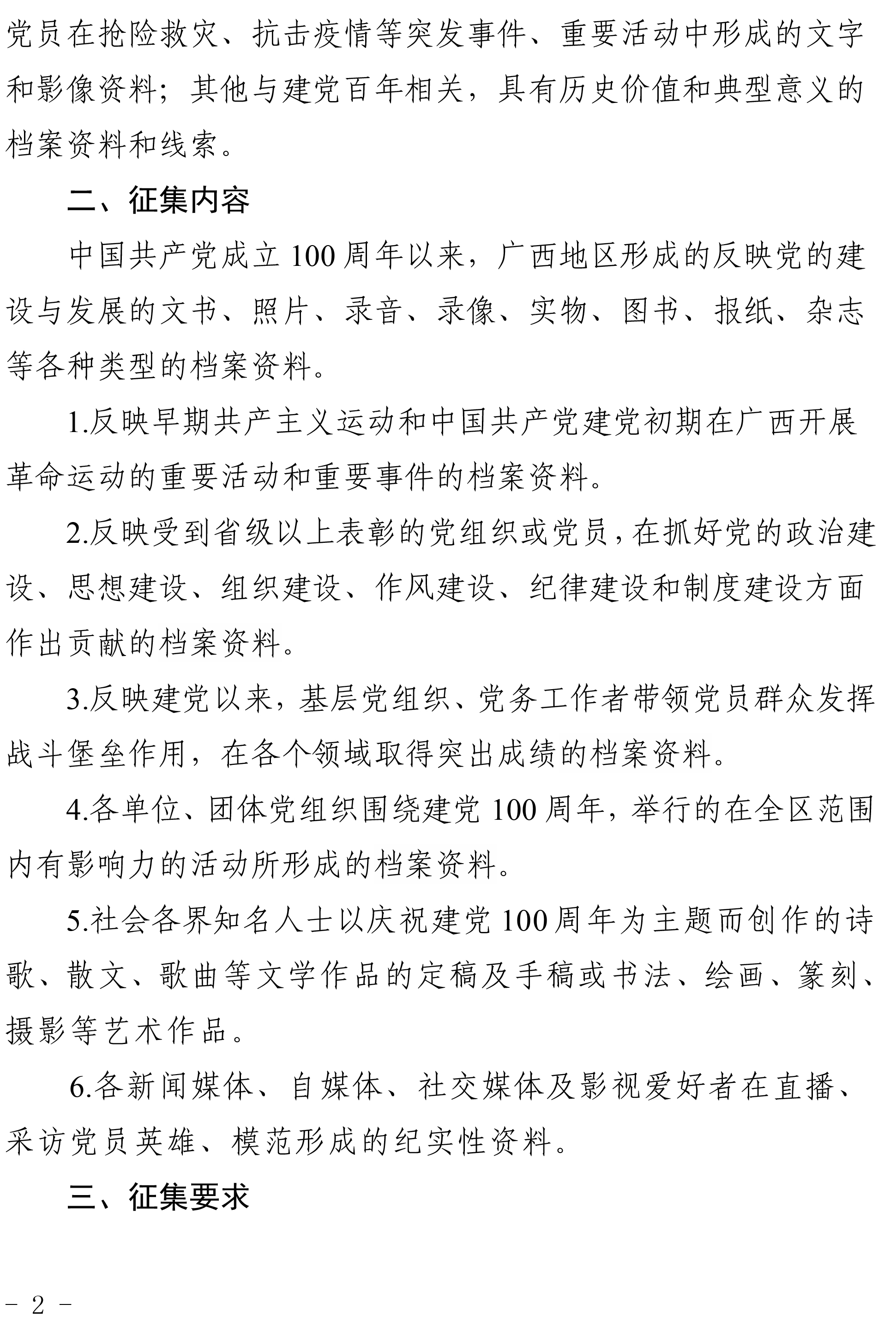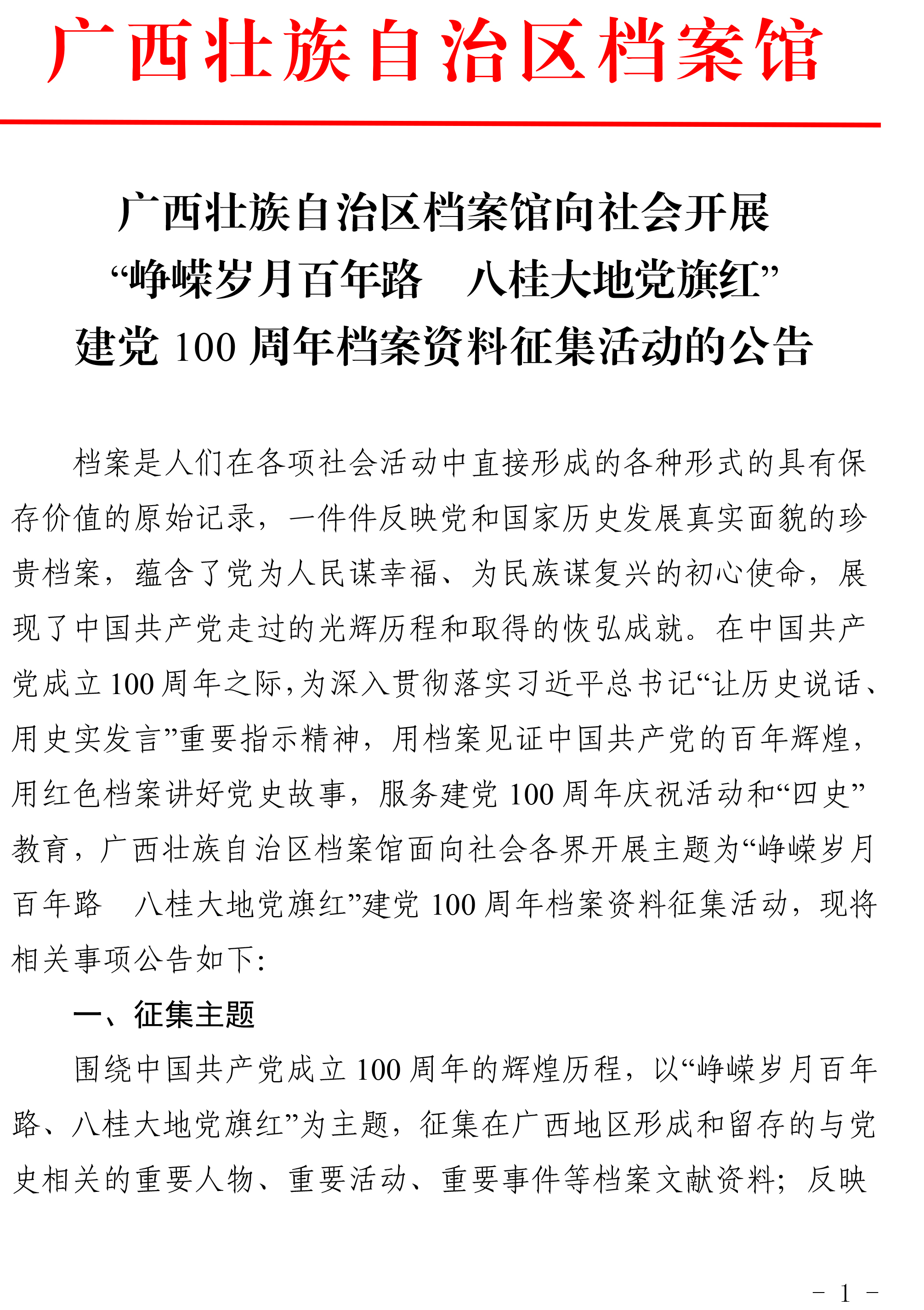 围绕中国共产党成立100周年的辉煌历程,以“峥嵘岁月百年路、八桂大地党旗红”为主题,征集在广西地区形成和留存的与党史相关的重要人物、重要活动、重要事件等档案文献资料;反映党员在抢险救灾、抗击疫情等突发事件、重要活动中形成的文字和影像资料;其他与建党百年相关,具有历史价值和典型意义的档案资料和线索。