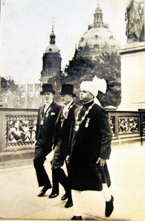中国代表团总领队王正廷(中)与国际奥委会官员步入会场。