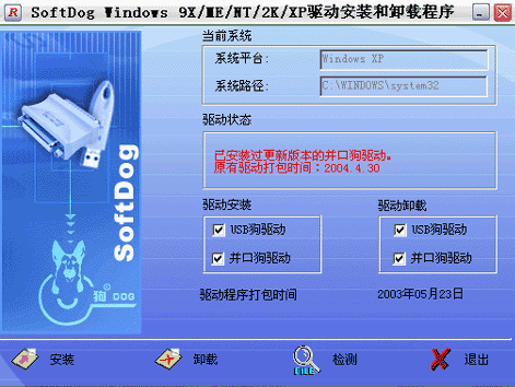 3.1、自动安装加密狗驱动。主程序安装完成后会自动弹出加密狗驱动安装界面,若检测加密狗没有安装,点击“安装”。如图: