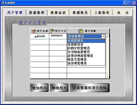 系统使用员——可以在所有模块录入数据、检索、打印;不能使用“系统维护”;