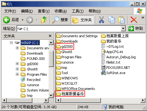 注意:若使用的是GD2000V2004(即V3.0)以上版本,第一次使用“数据备份”功能时,GD2000会自动在安装分区的根目录下建立名为“档案数据备份”的文件夹,并将此文件夹作为默认的备份文件夹,如下图:
